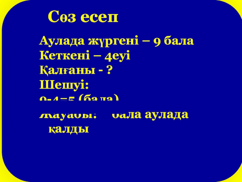 Сөз есепАулада жүргені – 9 балаКеткені – 4еуіҚалғаны - ?Шешуі:9-4=5 (бала)Жауабы: 	бала аулада қалды