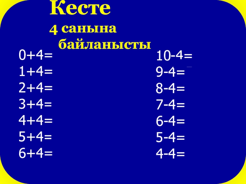 10-4=69-4=58-4=47-4=36-4=25-4=14-4=0Кесте4 санына байланысты0+4=41+4=52+4=63+4=74+4=85+4=96+4=10