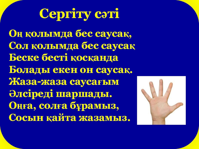 Сергіту сәтіОң қолымда бес саусақ,Сол қолымда бес саусақБеске бесті қосқандаБолады екен он саусақ.Жаза-жаза саусағымӘлсіреді шаршады.Оңға, солға бұрамыз,Сосын
