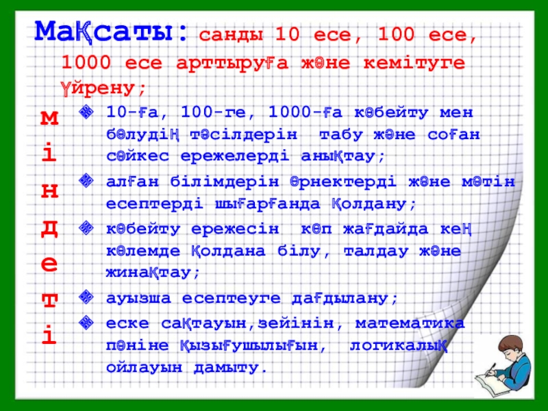 10-ға, 100-ге, 1000-ға көбейту мен бөлудің тәсілдерін табу және соған сәйкес ережелерді анықтау;