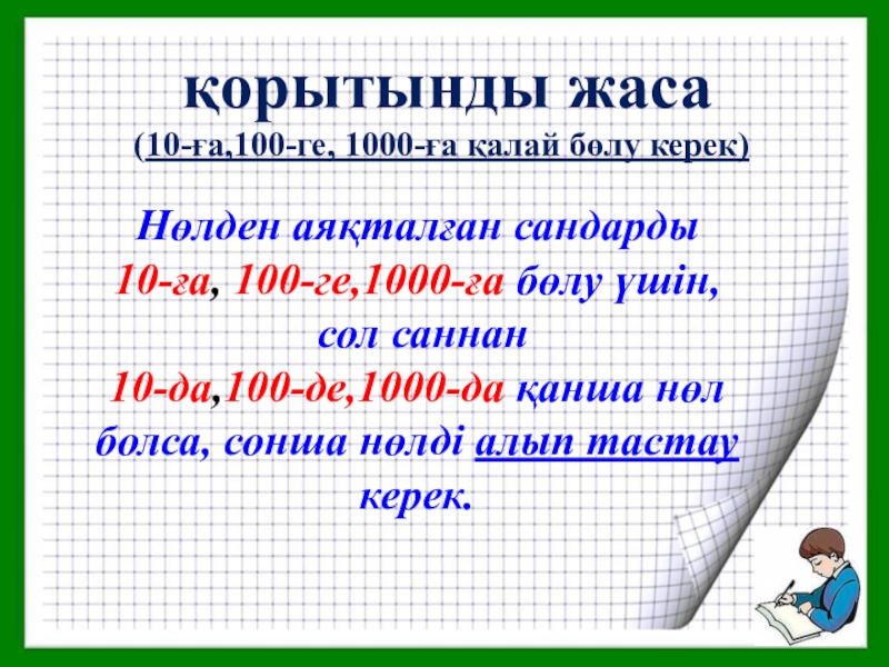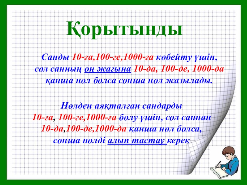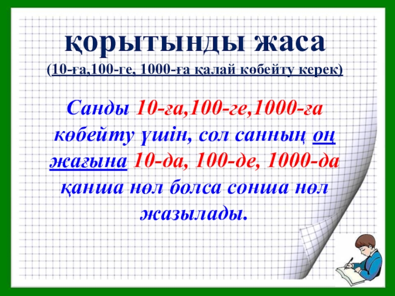сол санның оң жағына 10-да, 100-де, 1000-да қанша нөл болса сонша нөл жазылады.