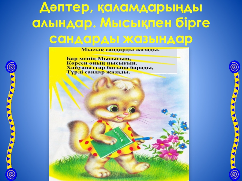 Дәптер, қаламдарыңды алындар. Мысықпен бірге сандарды жазындар