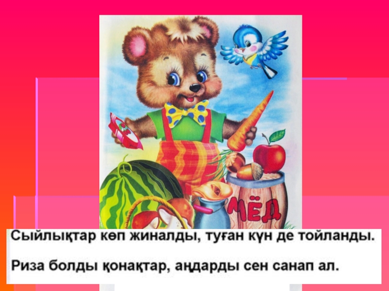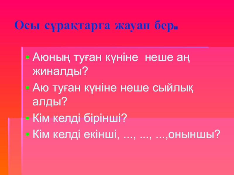 Осы сұрақтарға жауап бер.Аюның туған күніне неше аң жиналды?Аю туған күніне неше сыйлық алды?Кім келді бірінші?Кім келді