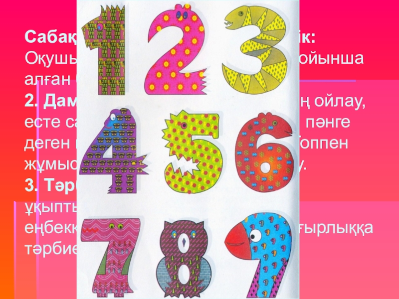 Слайд 2Сабақтың мақсаты: 1. Білімділік: Оқушылардың өткен сабақтарн бойынша алған білімдерін тексеру.