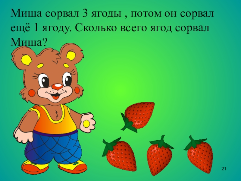 Слайд 21Миша сорвал 3 ягоды , потом он сорвал ещё 1 ягоду.
