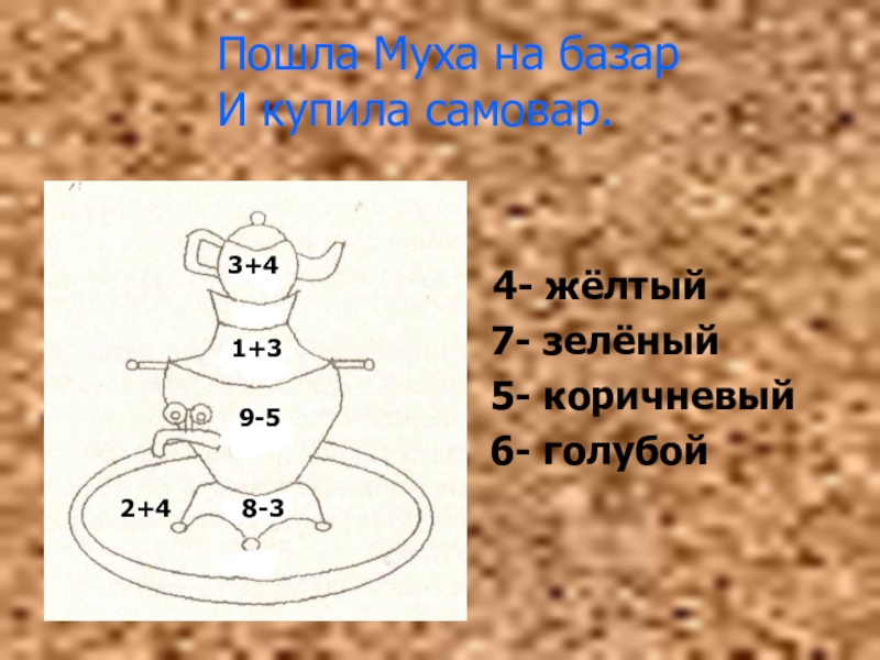 Пошла Муха на базар И купила самовар.  4- жёлтый  7- зелёный  5- коричневый