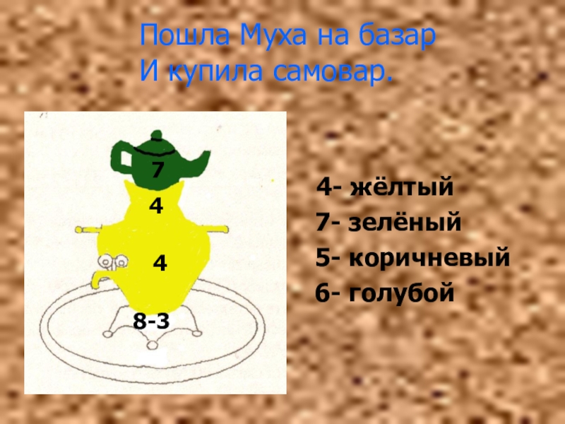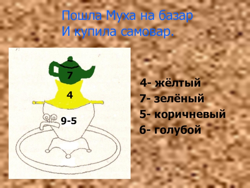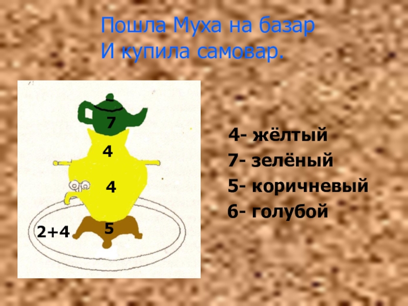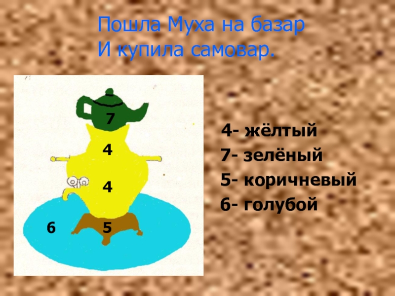 Пошла Муха на базар И купила самовар.   4- жёлтый  7- зелёный  5- коричневый