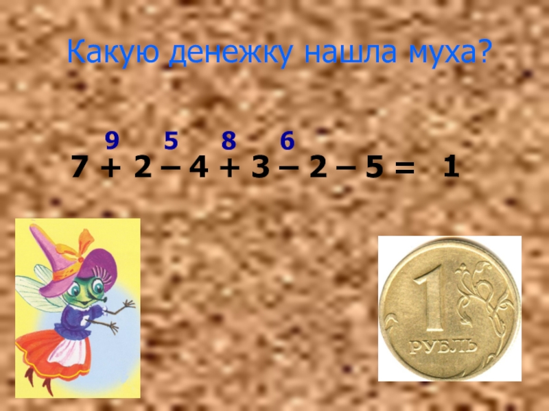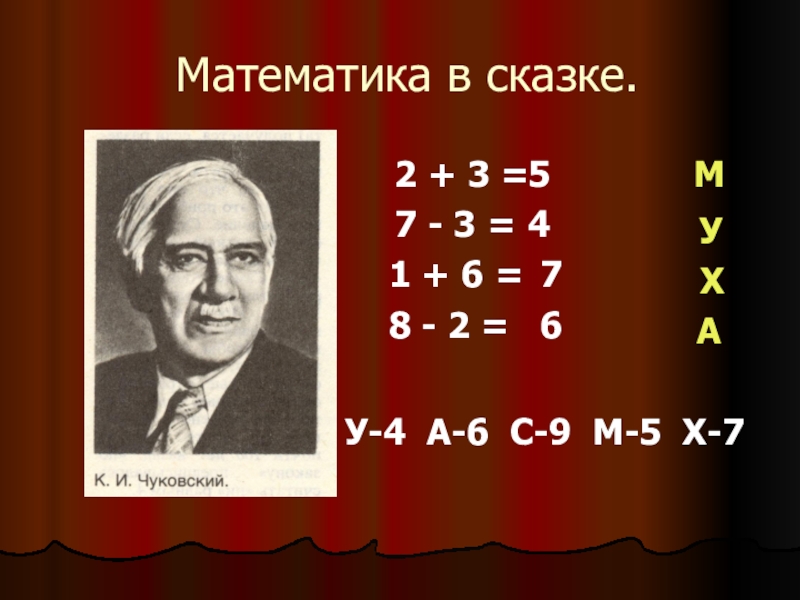 Математика в сказке. 2 + 3 =7 - 3 =1 + 6 =8 - 2 =5476У-4 А-6 С-9 М-5 Х-7М УХА