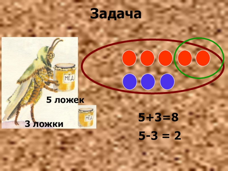 Задача 5 ложек3 ложки5+3=85-3 = 2