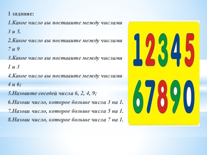 1 задание:1.Какое число вы поставите между числами 3 и 5.2.Какое число вы поставите между числами 7 и