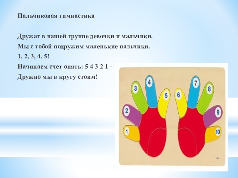 Пальчиковая гимнастикаДружат в нашей группе девочки и мальчики.Мы с тобой подружим маленькие пальчики.1, 2, 3, 4, 5!Начинаем