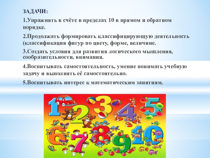 1.Упражнять в счёте в пределах 10 в прямом и обратном порядке.