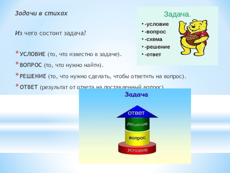 Задачи в стихахИз чего состоит задача?УСЛОВИЕ (то, что известно в задаче).ВОПРОС (то, что нужно найти).РЕШЕНИЕ (то, что