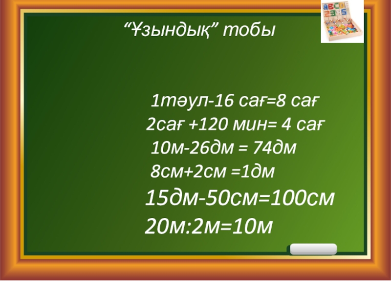 “Ұзындық” тобыӨлшем бірліктеріне өрнекте1дм=10 см1м= 10 дм1м= 100 см1 км= 1000 м1см= 10 мм