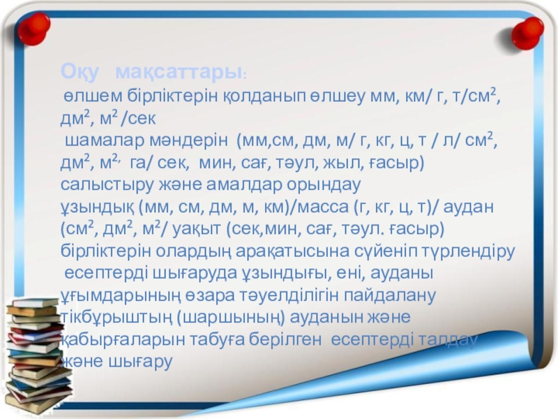 Оқу  мақсаттары: өлшем бірліктерін қолданып өлшеу мм, км/ г, т/см2, дм2, м2 /сек шамалар мәндерін (мм,см,