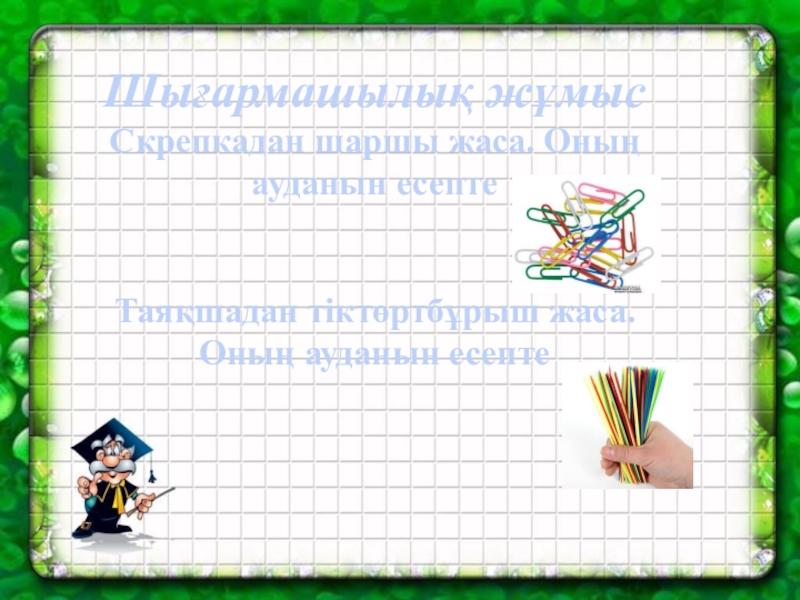 Шығармашылық жұмысСкрепкадан шаршы жаса. Оның ауданын есептеТаяқшадан тіктөртбұрыш жаса. Оның ауданын есепте