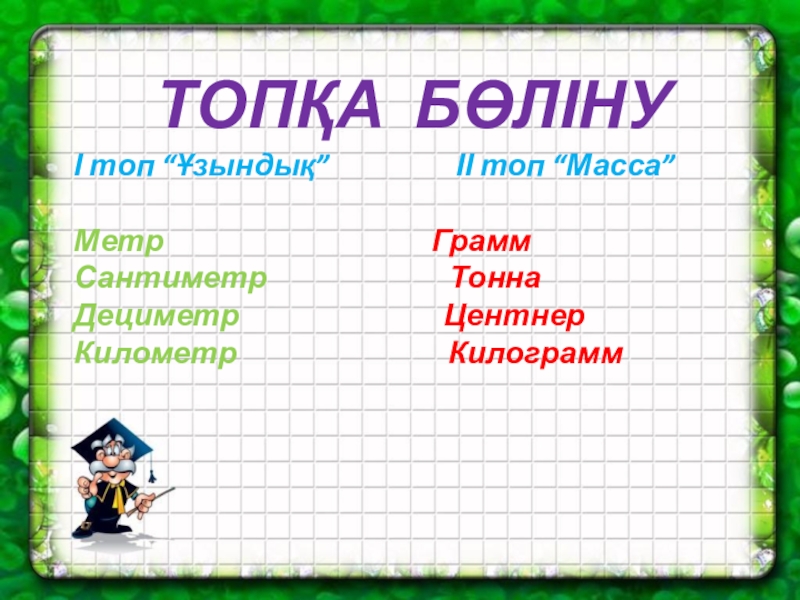 ТОПҚА БӨЛІНУІ топ “Ұзындық” ІІ топ “Масса”Метр ГраммСантиметр