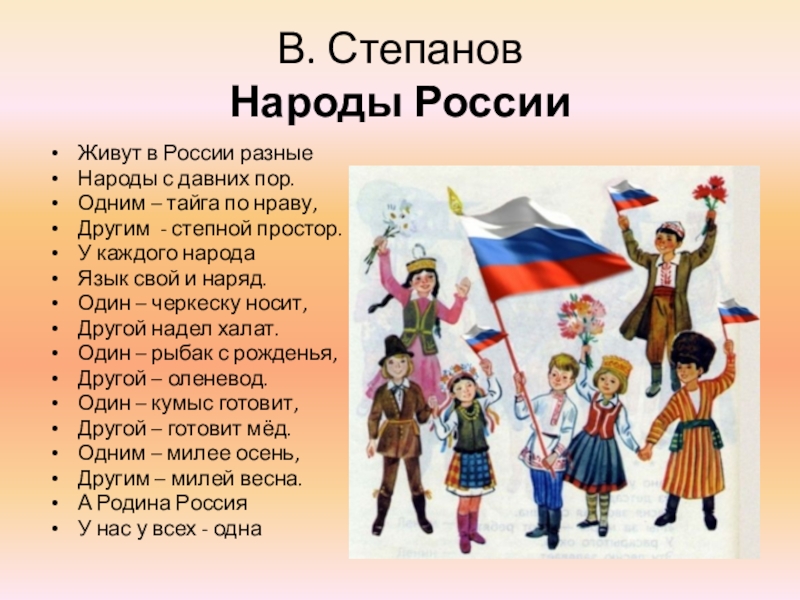 В. Степанов Народы РоссииЖивут в России разныеНароды с давних пор.Одним – тайга по нраву,Другим - степной простор.У каждого народаЯзык свой и наряд.Один – черкеску носит, Другой надел халат.Один – рыбак с рожденья, Другой – оленевод.Один –