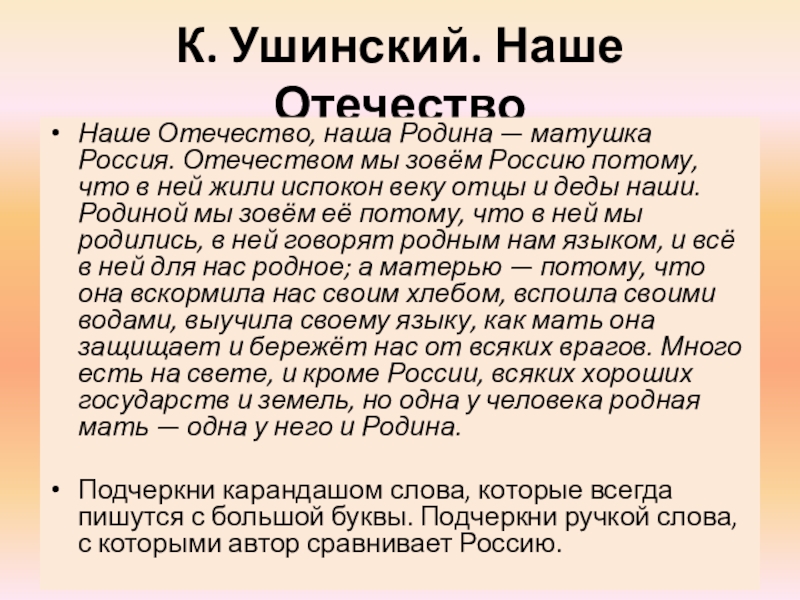 К. Ушинский. Наше ОтечествоНаше Отечество, наша Родина — матушка Россия. Отечеством мы зовём Россию потому, что в
