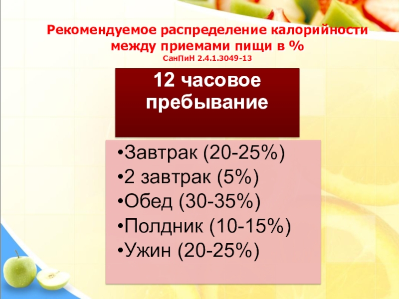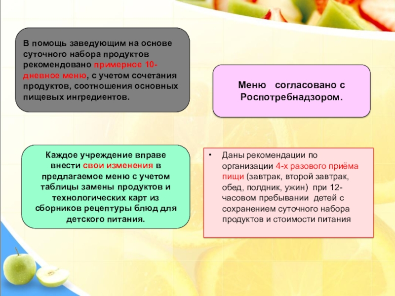 Даны рекомендации по организации 4-х разового приёма пищи (завтрак, второй завтрак, обед, полдник, ужин) при 12-часовом пребывании детей с сохранением суточного набора продуктов и стоимости питания