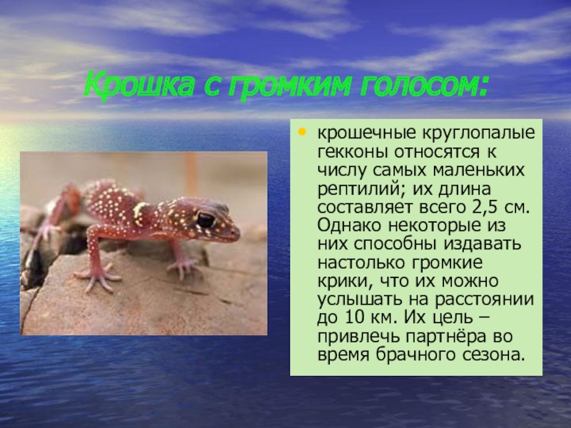 маленьких рептилий; их длина составляет всего 2,5 см. Однако некоторые из них способны издавать настолько громкие крики, что их можно услышать на расстоянии до 10 км. Их цель – привлечь партнёра во время брачного сезона.