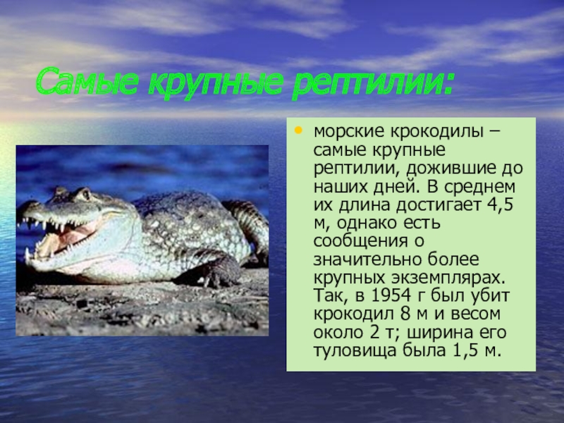 наших дней. В среднем их длина достигает 4,5 м, однако есть сообщения о значительно более крупных экземплярах. Так, в 1954 г был убит крокодил 8 м и весом около 2 т; ширина его туловища была 1,5 м.