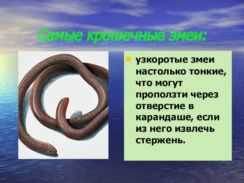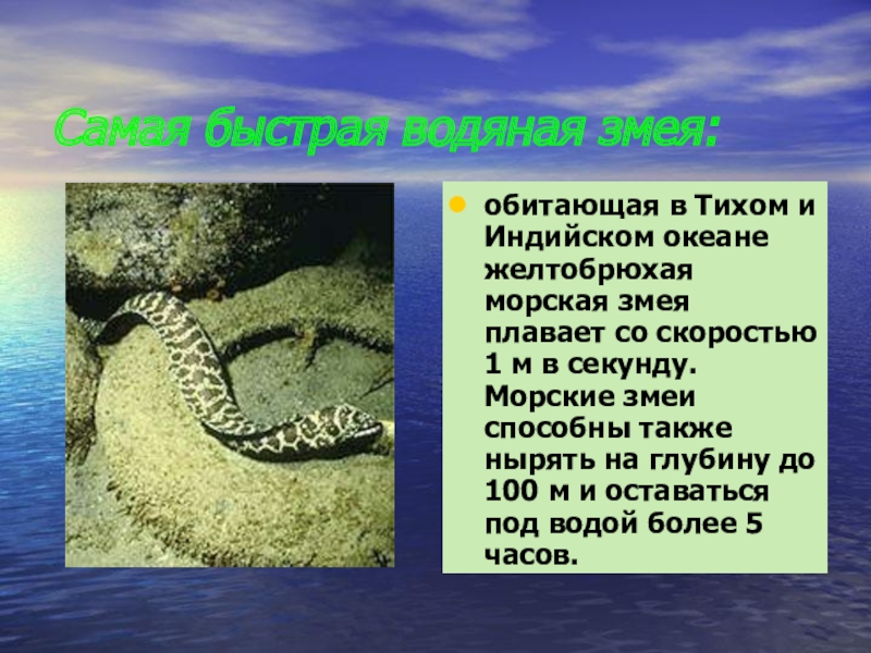 морская змея плавает со скоростью 1 м в секунду. Морские змеи способны также нырять на глубину до 100 м и оставаться под водой более 5 часов.