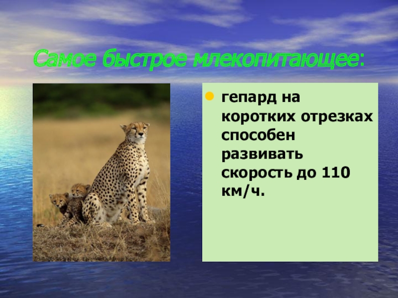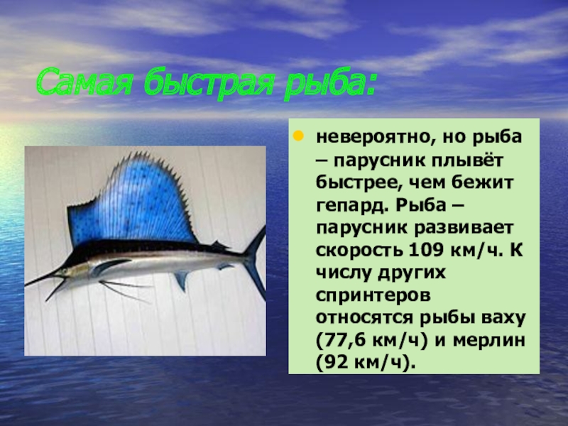 бежит гепард. Рыба – парусник развивает скорость 109 км/ч. К числу других спринтеров относятся рыбы ваху (77,6 км/ч) и мерлин (92 км/ч).