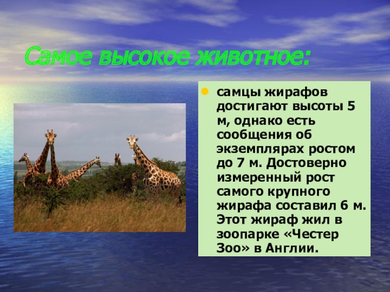 сообщения об экземплярах ростом до 7 м. Достоверно измеренный рост самого крупного жирафа составил 6 м. Этот жираф жил в зоопарке «Честер Зоо» в Англии.