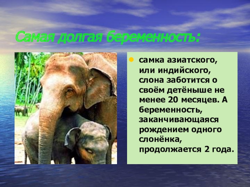 детёныше не менее 20 месяцев. А беременность, заканчивающаяся рождением одного слонёнка, продолжается 2 года.
