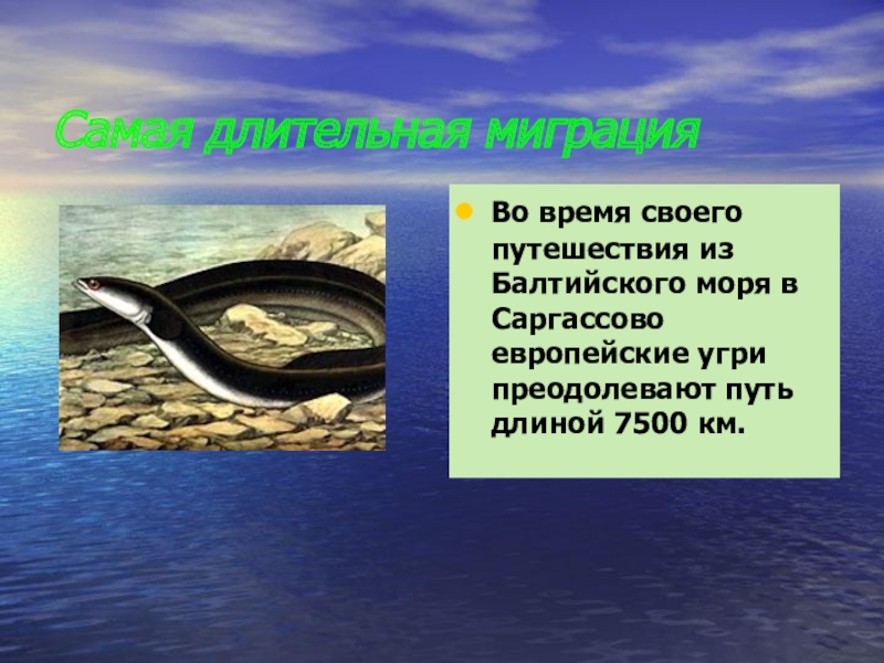 Саргассово европейские угри преодолевают путь длиной 7500 км.