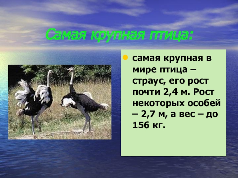 одно яйцо упало с вертолёта с высоты 183 м и не разбилось. Скорлупа страусиных яиц способна выдержать человека весом 115 кг. Длина страусиного яйца 13,5 см, а вес – 1,65 кг.