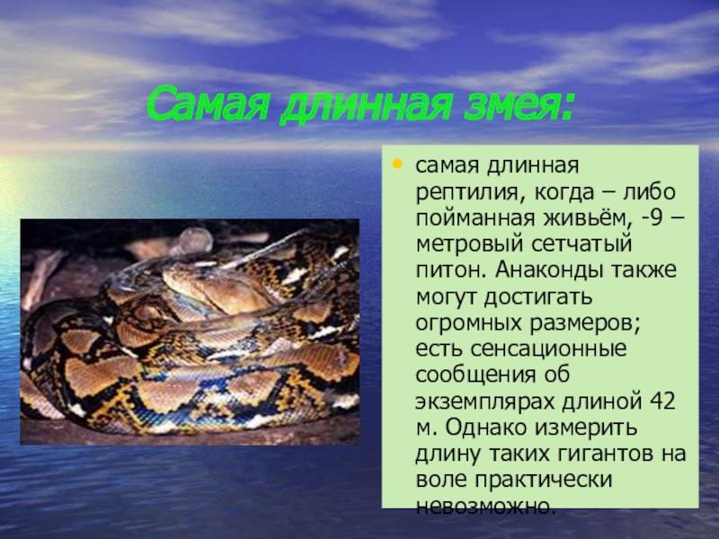 -9 – метровый сетчатый питон. Анаконды также могут достигать огромных размеров; есть сенсационные сообщения об экземплярах длиной 42 м. Однако измерить длину таких гигантов на воле практически невозможно.