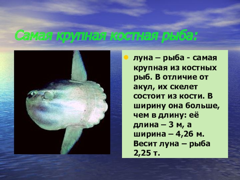 костных рыб. В отличие от акул, их скелет состоит из кости. В ширину она больше, чем в длину: её длина – 3 м, а ширина – 4,26 м. Весит луна – рыба 2,25 т.