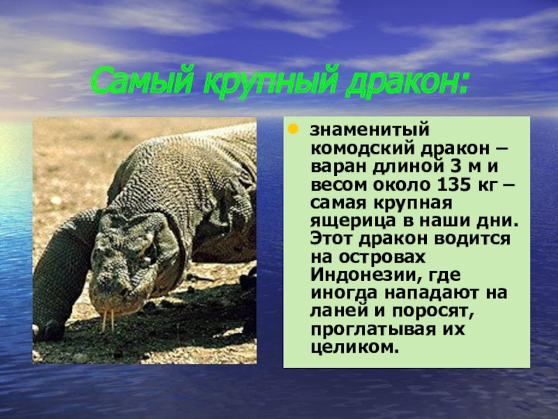 и весом около 135 кг – самая крупная ящерица в наши дни. Этот дракон водится на островах Индонезии, где иногда нападают на ланей и поросят, проглатывая их целиком.