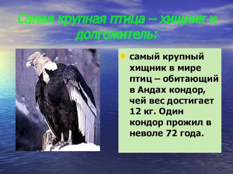мире птиц – обитающий в Андах кондор, чей вес достигает 12 кг. Один кондор прожил в неволе 72 года.