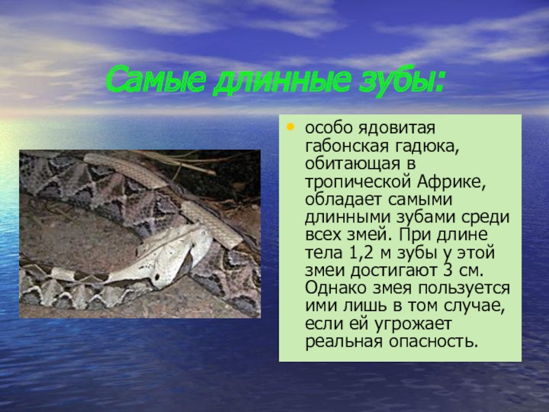 обладает самыми длинными зубами среди всех змей. При длине тела 1,2 м зубы у этой змеи достигают 3 см. Однако змея пользуется ими лишь в том случае, если ей угрожает реальная опасность.