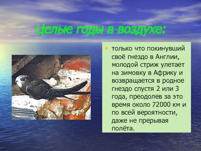 молодой стриж улетает на зимовку в Африку и возвращается в родное гнездо спустя 2 или 3 года, преодолев за это время около 72000 км и по всей вероятности, даже не прерывая полёта.
