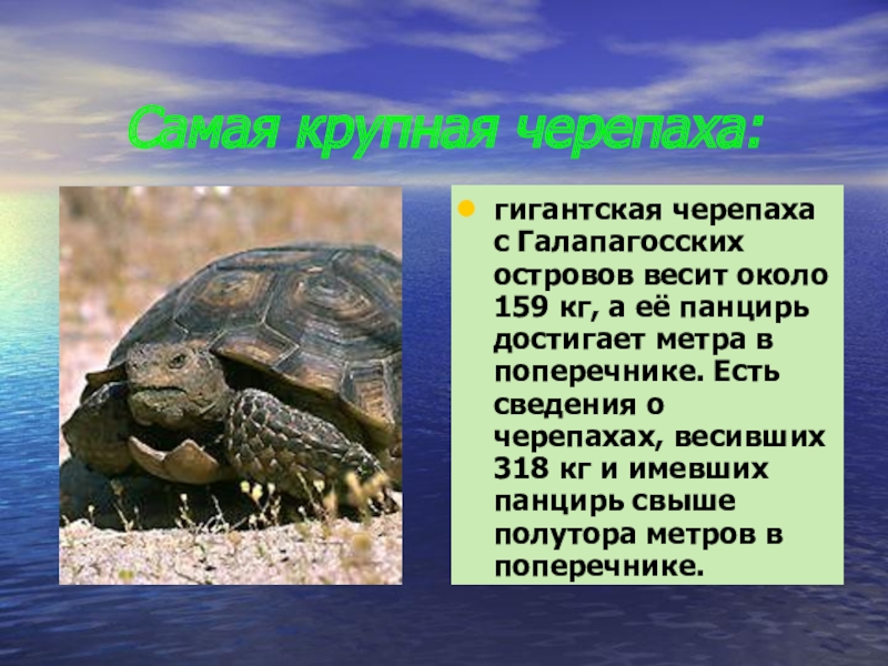 кг, а её панцирь достигает метра в поперечнике. Есть сведения о черепахах, весивших 318 кг и имевших панцирь свыше полутора метров в поперечнике.