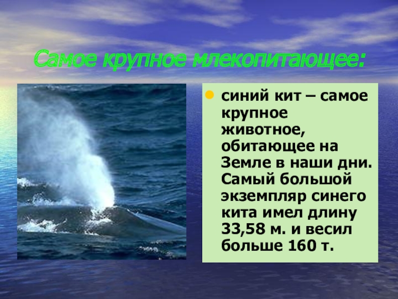 Земле в наши дни. Самый большой экземпляр синего кита имел длину 33,58 м. и весил больше 160 т.