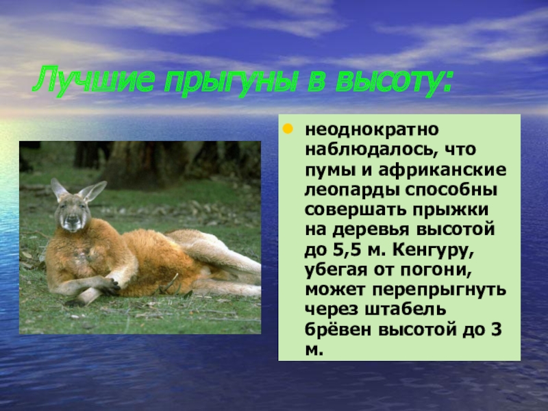 способны совершать прыжки на деревья высотой до 5,5 м. Кенгуру, убегая от погони, может перепрыгнуть через штабель брёвен высотой до 3 м.