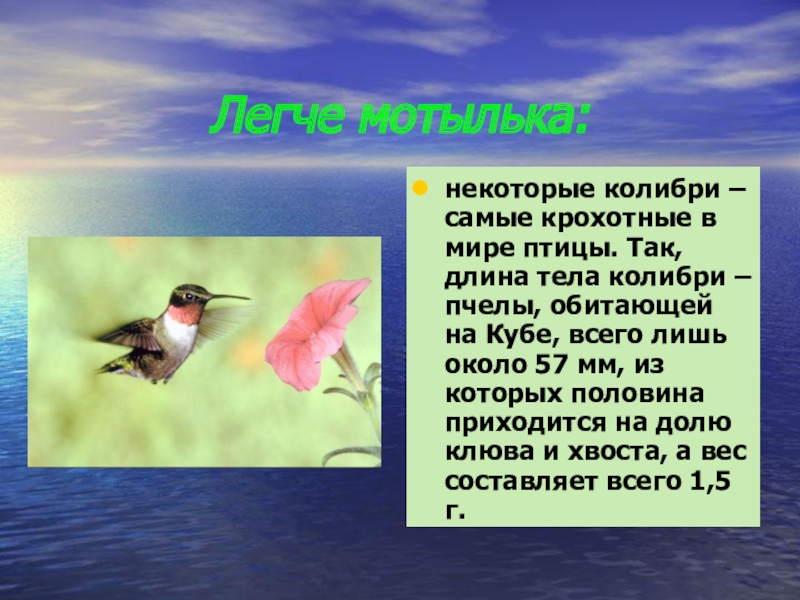 длина тела колибри – пчелы, обитающей на Кубе, всего лишь около 57 мм, из которых половина приходится на долю клюва и хвоста, а вес составляет всего 1,5 г.