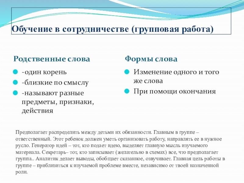 Предполагает распределить между детьми их обязанности. Главным в группе –ответственный. Этот ребенок должен уметь организовать работу, направлять ее в нужное русло. Генератор идей – тот, кто подает идею, выделяет главную мысль изучаемого материала. Секретарь– тот, кто записывает (желательно в схемах) все, что предполагает группа.. Аналитик делает выводы, обобщает сказанное, озвучивает. Главная цель работы в группе – приблизиться к изучаемой проблеме вместе, независимо от твоей назначенной роли.