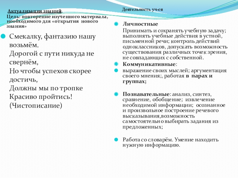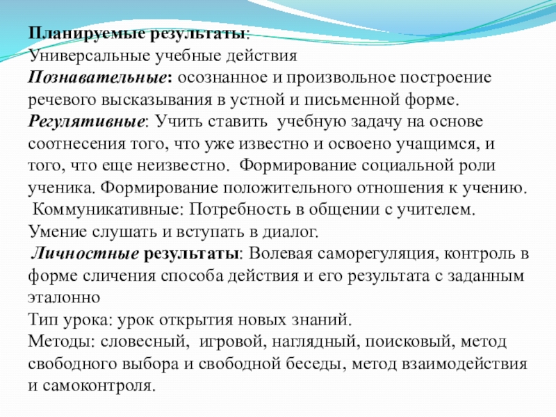 Принимать и сохранять учебную задачу; выполнять учебные действия в устной, письменной речи; контроль действий одноклассников, допускать возможность существования различных точек зрения, не совпадающих с собственной.