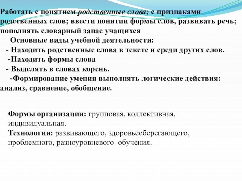 Формы организации: групповая, коллективная, индивидуальная.
