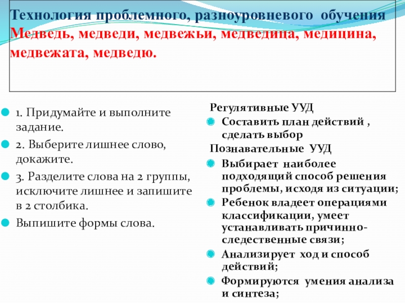 Познавательные: анализ, синтез, сравнение, обобщение; извлечение необходимой информации; осознанное и произвольное построение речевого высказывания,возможность самостоятельно выбирать задания из предложенных;