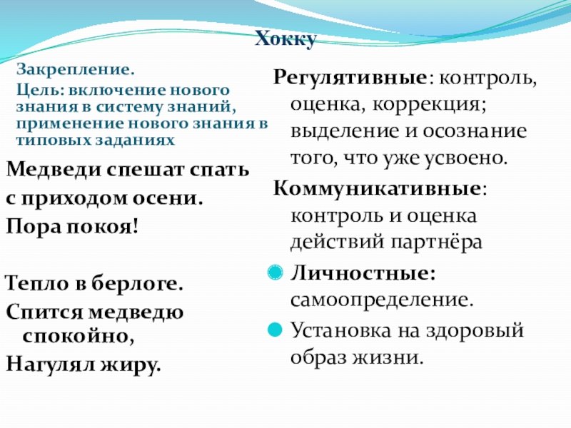 Регулятивные: контроль, оценка, коррекция; выделение и осознание того, что уже усвоено.