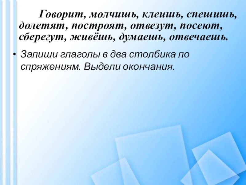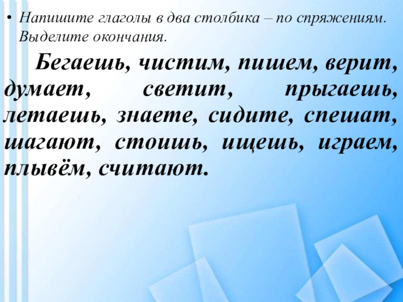 Запиши глаголы в два столбика по спряжениям. Выдели окончания.