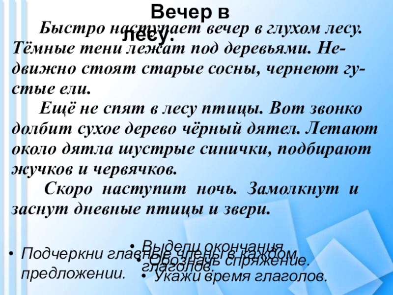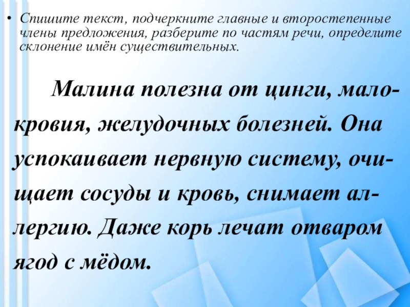 Спишите текст, подчеркните главные и второстепенные члены предложения, разберите по частям речи, определите склонение имён существительных.