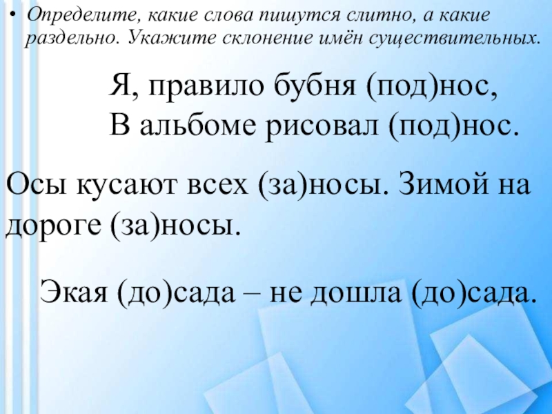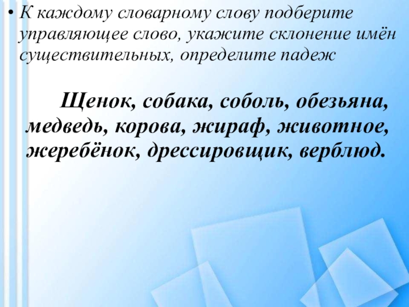 К каждому словарному слову подберите управляющее слово, укажите склонение имён существительных, определите падеж
